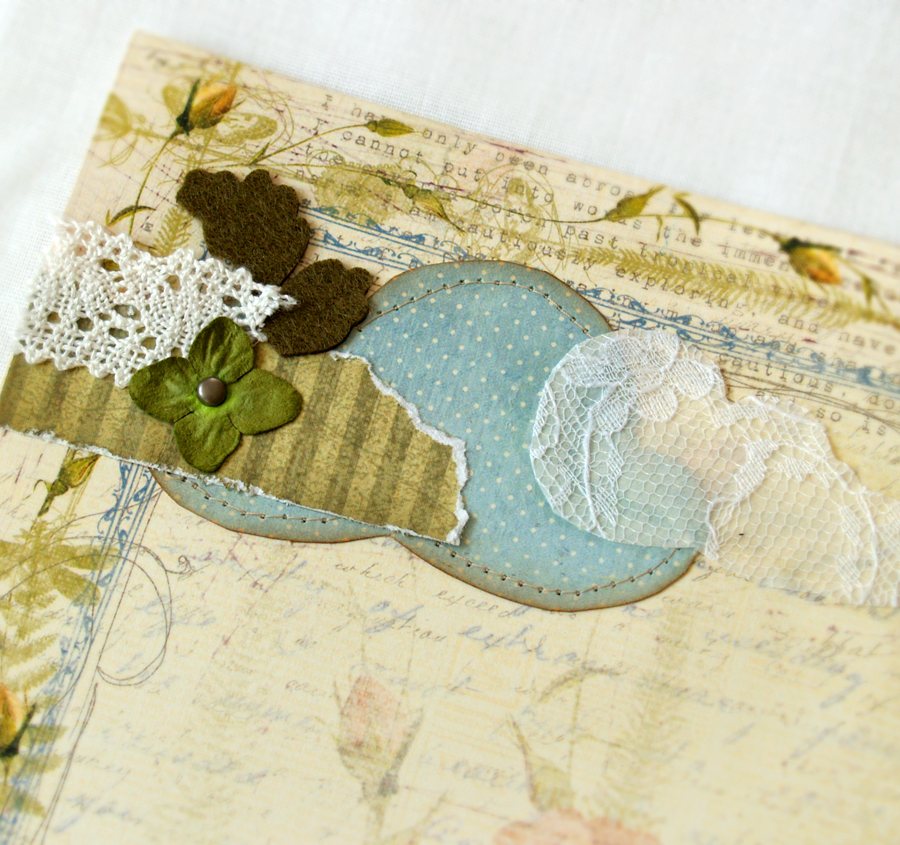 Материалы: бумага Prima, Graphic 45, фетровая высечка и цветы Prima, кружево, вощеный шнур, рамочка, брадсы BoBunny, самопечатная пленка, ткань, натирка.